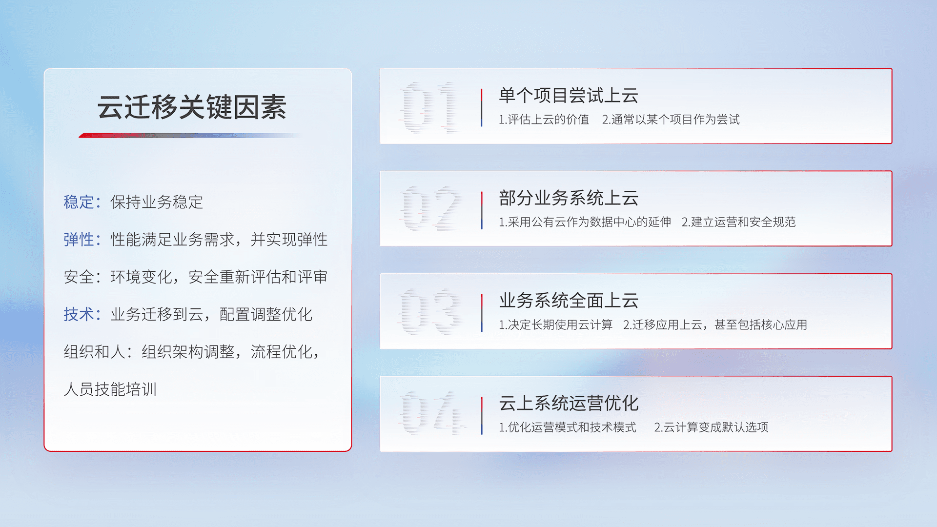 结合实际业务,,,,从规划设计、、、、云平台选型、、、、云原生改造、、、数据迁移、、、集成交付,,,迁移全过程为客户识别最佳上云路径,,,,做好风险识别管理,,,设计网络架构、、、、身份权限、、、安全审计合规、、、、操作审计、、、日志审计、、监控告警策略、、、多站点容灾设计等,,,对云上基础设施进行整体规划,,提升IT治理水平,,以满足弹性、、、高可用、、、、高性能的需求。。